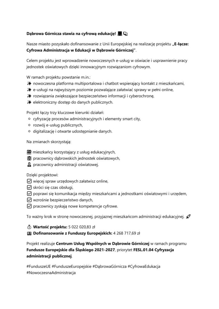 W Dąbrowie Górniczej rusza nabór do II edycji programu „Cash for Work” szukamy ukraińskich asystentów międzykulturowych, którzy będą wspierać ukraińskich uczniów w szkołach i przedszkolach. Jeśli szukasz pracy, jesteś obywatelem Ukrainy, znasz język polski i chcesz pomóc dzieciom w aklimatyzacji, zadzwoń 662 138 265. NA CZYM POLEGA PROGRAM? „Cash for Work” – to program interwencyjnego zatrudniania uchodźców, działa w oparciu o wytyczne Organizacji Narodów Zjednoczonych. Dzięki projektowi pomożemy ukraińskim uczniom w procesie adaptacji w szkołach i przedszkolach. Asystenci z Ukrainy będą też wsparciem dla polskich dyrektorów i nauczycieli. Projekt finansowany jest ze środków Fundacji Polskiego Centrum Pomocy Międzynarodowej oraz Care International. KTO MOŻE ZOSTAĆ POMOCĄ NAUCZYCIELA (ASYSTENTEM MIĘDZYKULTUROWYM)? Osoby które przekroczyły granicę po 24 lutego 2022 r i spełniają następujące kryteria: • wykształcenie średnie lub wyższe, • nie musi posiadać kwalifikacji pedagogicznych, • znajomość języka polskiego w mowie i piśmie w stopniu umożliwiającym pomoc uczniowi z Ukrainy. WARUNKI UMOWY • Umowa będzie podpisywana na 9 miesięcy. • Rodzaj umowy – umowa zlecenie. • Liczba godzin pracy: 6 godzin dziennie, nie więcej niż 132 godziny miesięcznie. ZAKRES ZADAŃ ASYSTENTÓW Z UKRAINY? • Podejmowanie współpracy z pracownikami szkoły w realizacji zadań opiekuńczych w stosunku do uczniów i wychowanków pochodzących z Ukrainy. • Udzielanie uczniom pochodzącym z Ukrainy pomocy w odrabianiu prac domowych. • Wspieranie uczniów pochodzącym z Ukrainy w pokonywaniu trudności adaptacyjnych. • Wspieranie uczniów pochodzącym z Ukrainy w kontaktach z nauczycielami. • Pośredniczenie w kontaktach pomiędzy szkołą a opiekunami uczniów pochodzących z Ukrainy. JAK MOŻNA UZYSKAĆ INFORMACJE ? • Należy umówić się na rejestrację pod numerem telefonu: 662 138 265 – w dni robocze w godzinach: 9.00 – 13.00. Wnioski przyjmujemy do 15 września 2022 r.